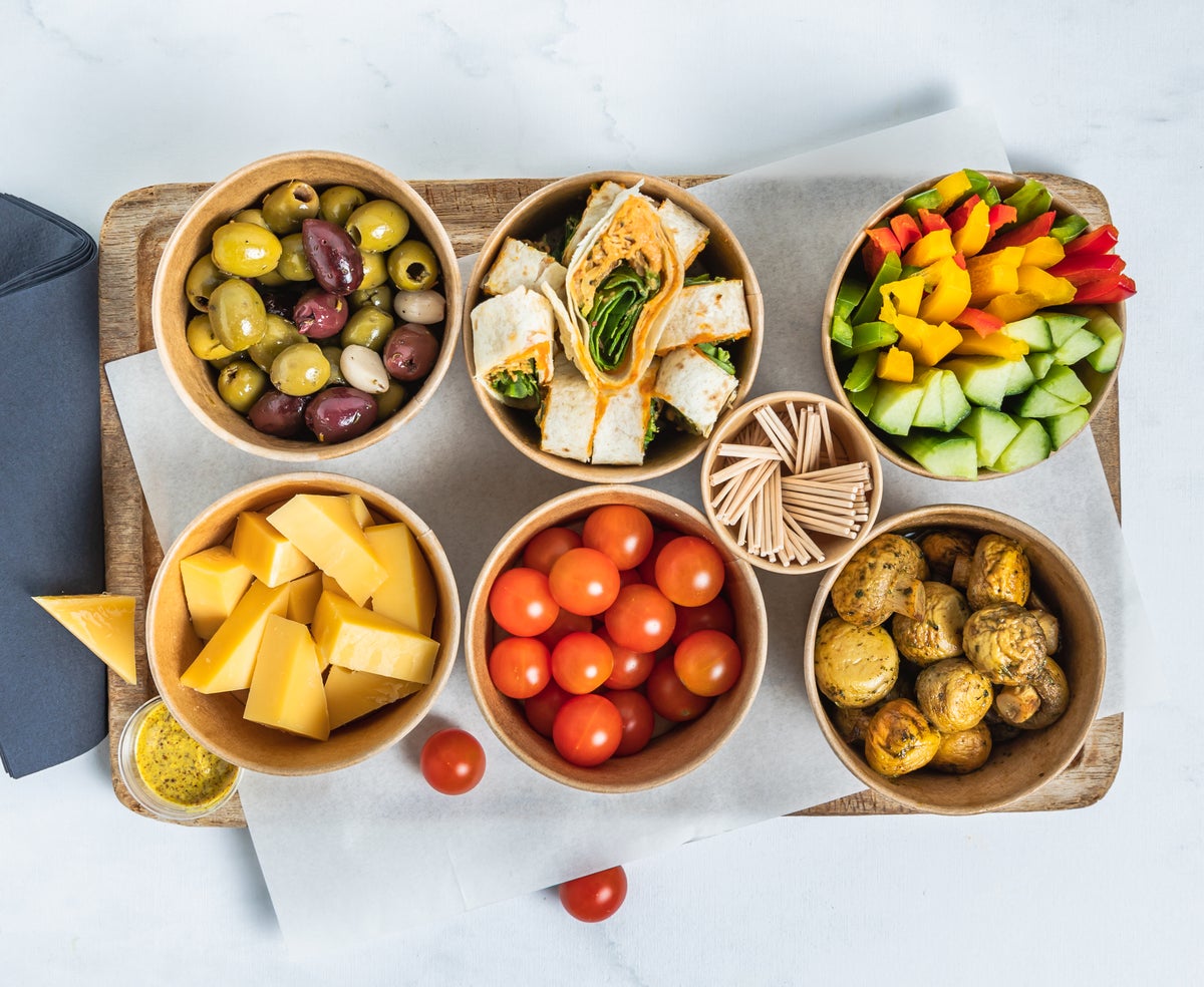 Assortiment hapjes waaronder crudités, kaas, mini wrap, champignon en zoutjes. (60 hapjes).
