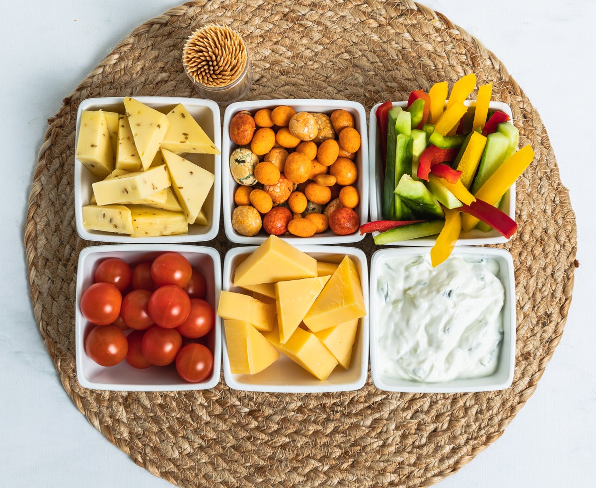 Olijven, groentesticks, tomaatjes, kaaspuntjes en gebrande notenmelange. Vanaf 10 personen.