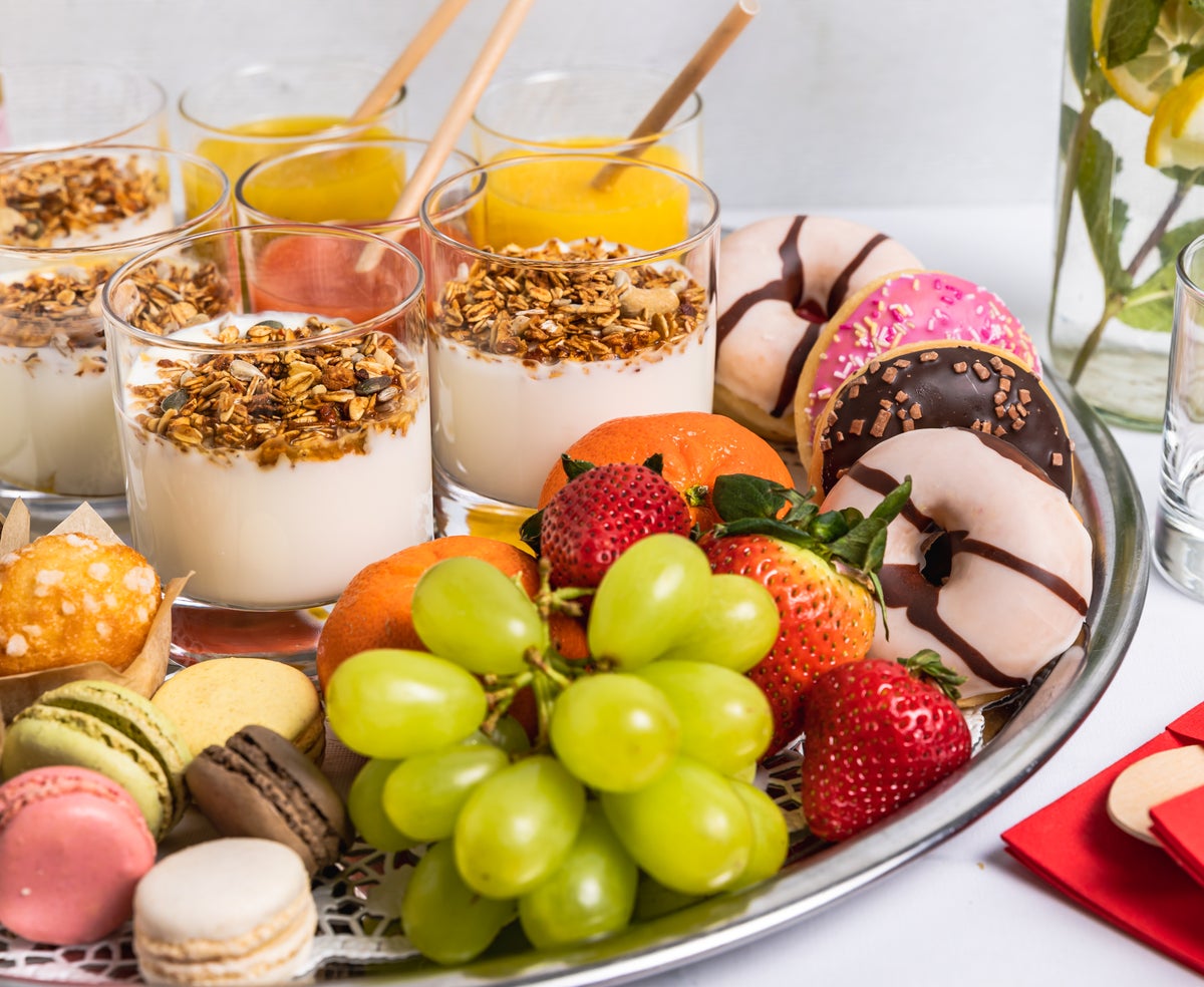 Plateau met diverse zoetigheden, yoghurt met muesli en honing, fruit, smoothie en een fles fruit&kruid.