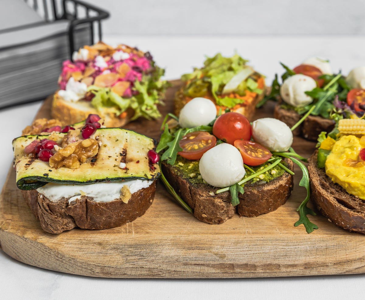 Dikke mini boterhammen met beleg van o.a. geitenkaas, humus en mozzarella.